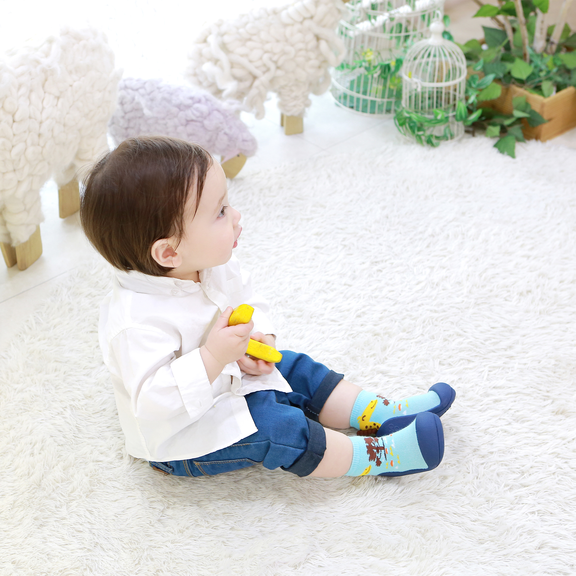 - Giraffe Blue – Cool-toned forest scene with navy sole and playful duck & tree details