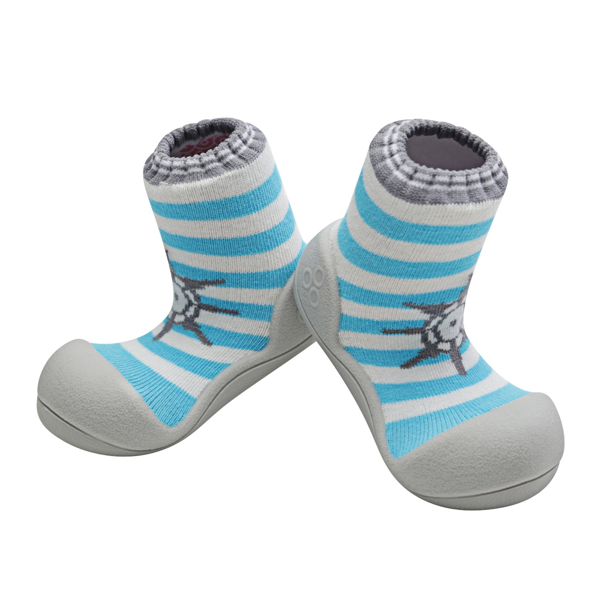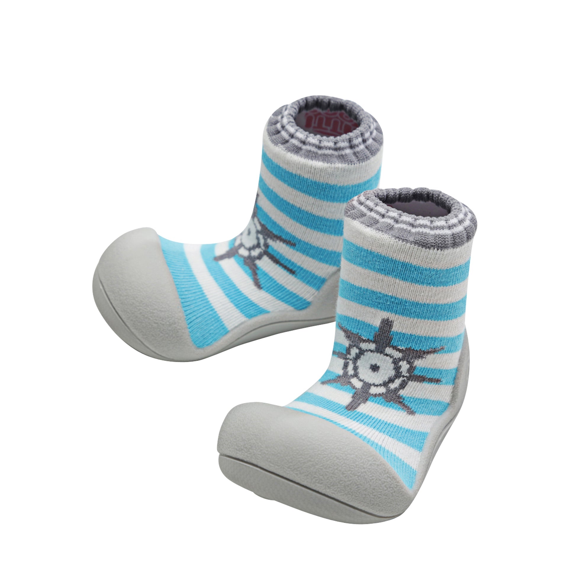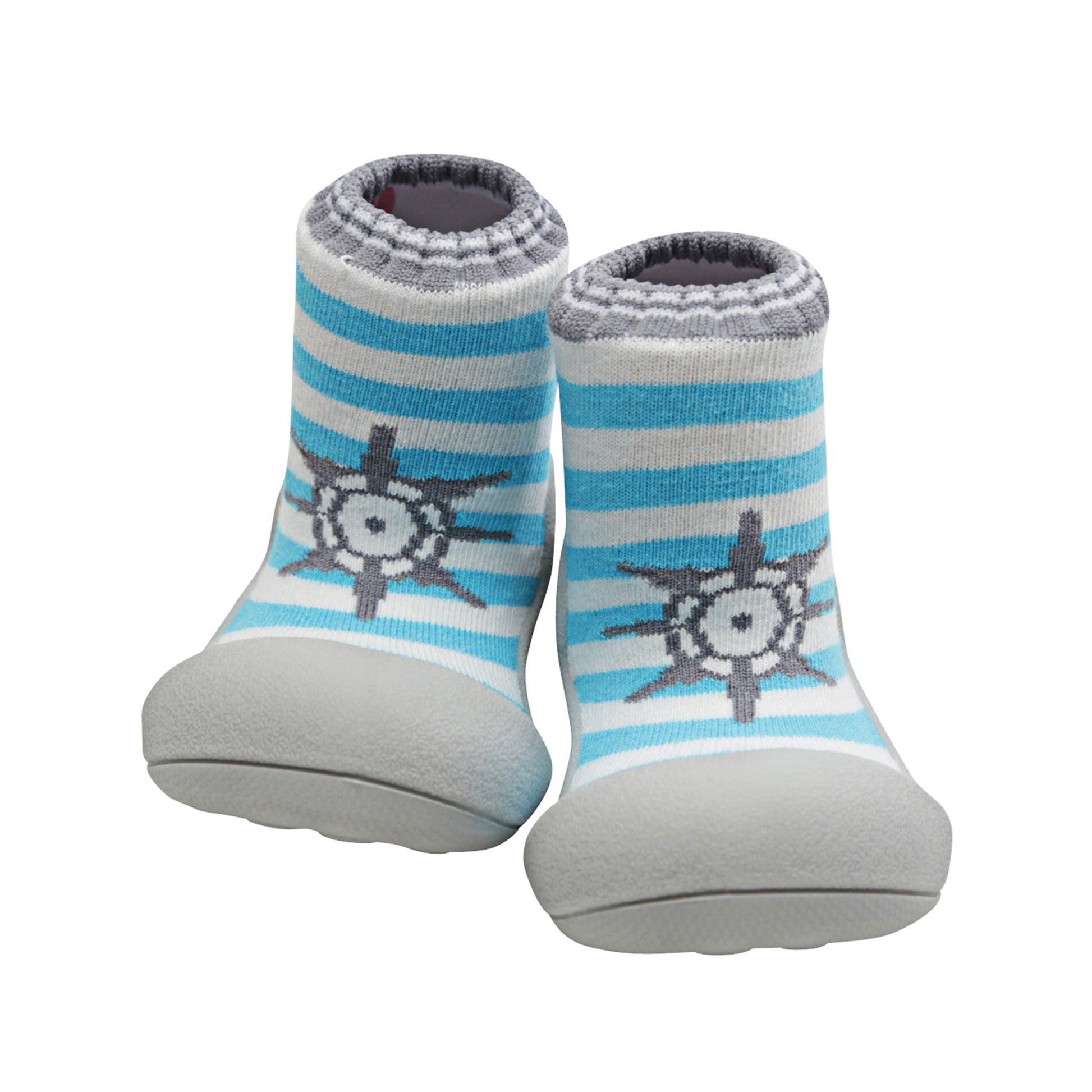 - Marine Green – Grey sole, soft aqua blue & white stripes with a helm steering wheel design