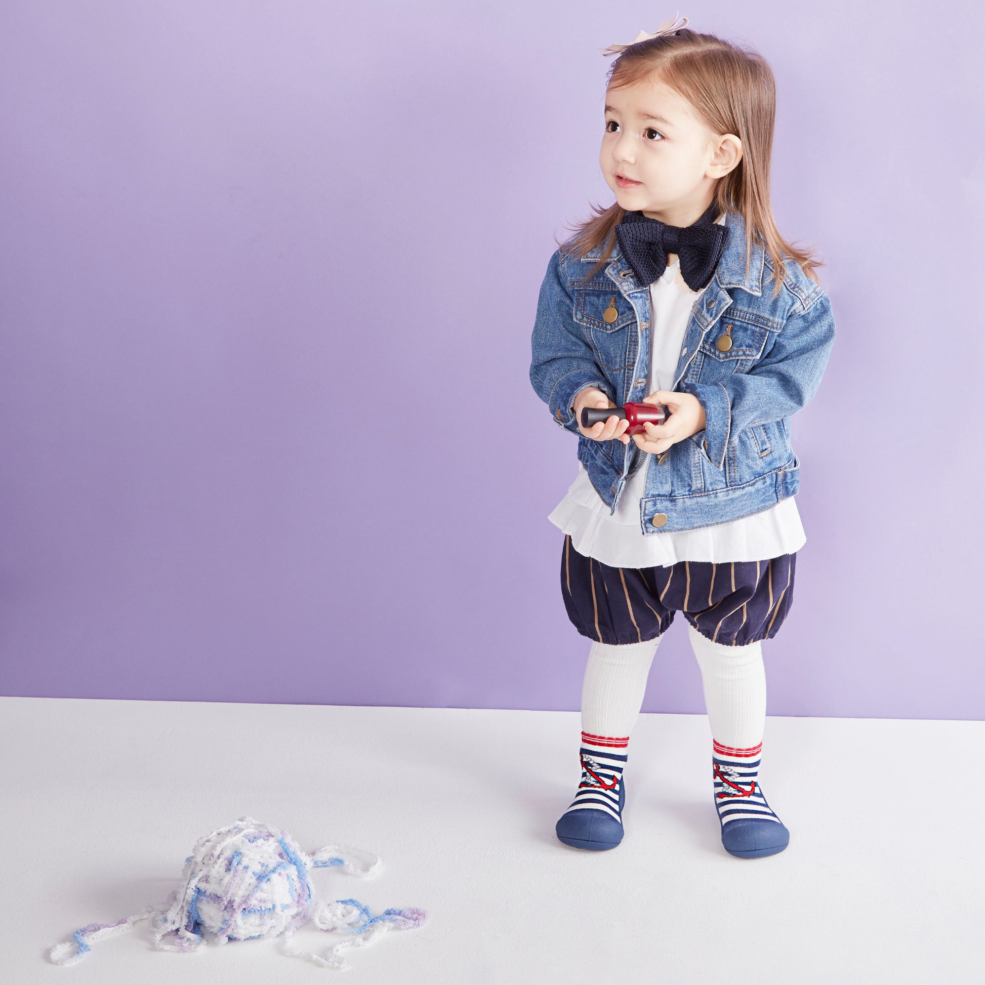 - Marine Blue – Navy sole, navy & white stripes with orange polka dots and anchor pattern