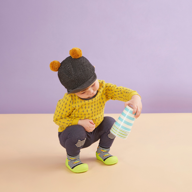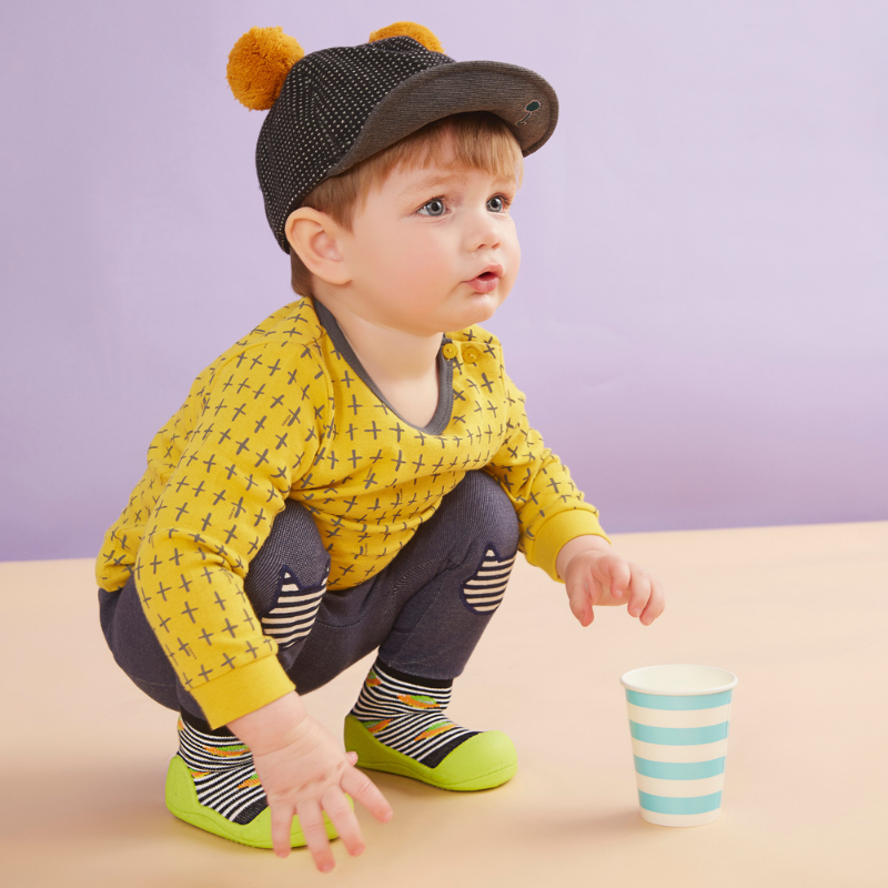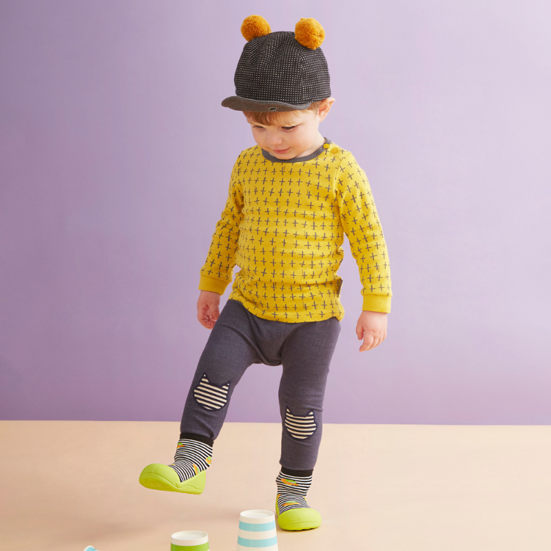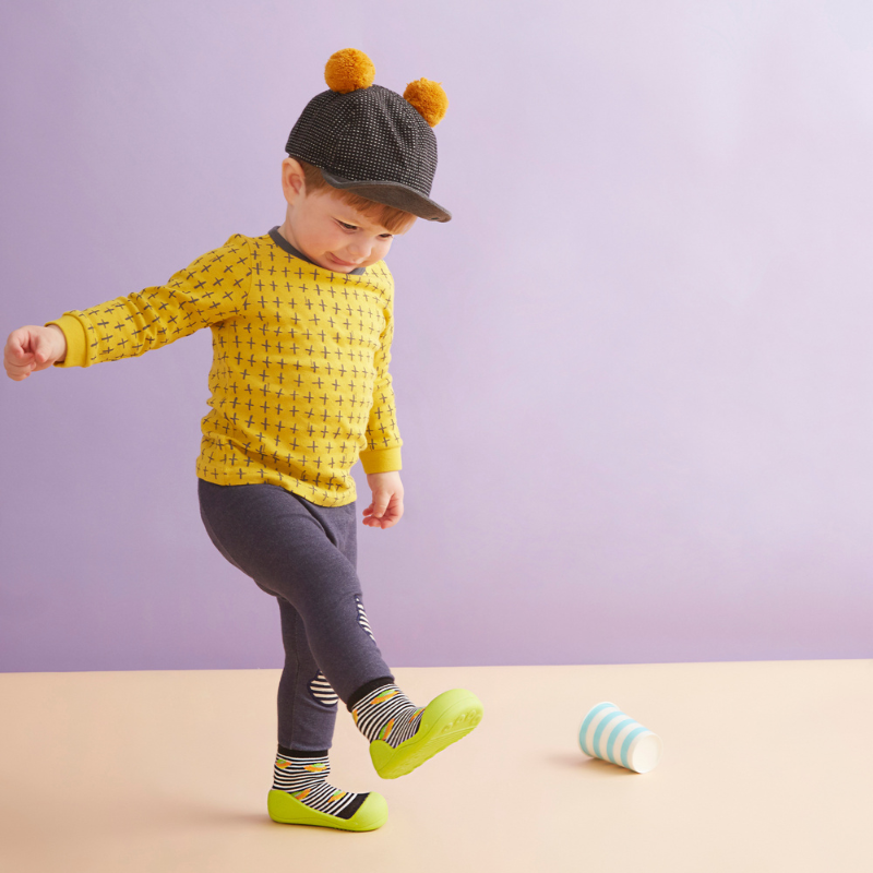 With its bold lime green sole and soft cotton upper, this shoe is perfect for little ones ready to explore the universe—starting from the living room!